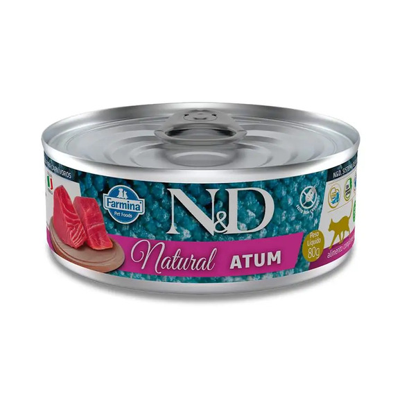 Ração Úmida N&.D Natural Gatos AtumA Ração Úmida N&.D Natural Gatos foi desenvolvida com o propósito de agradar os gatos de todas as raças, que tendem a ter um paladar exigente e gostam de alimentos específicos.Indicado como um complemento para a alimentação, a Ração N&.D para gatos é feita sem a adição de grãos e conservantes artificiais, sendo um alimento completamente natural.Encontre a maior variedade de alimentos para seu pet como a Ração Úmida N&.D Natural com preço especial aqui na . Compre pelo site, app ou em uma de nossas lojas.Modo de usoA Ração N&.D fornece cerca de 25% da ingestão diária de calorias recomendada para um gato de 4 kg de peso corporal. A fim de manter a refeição diária completa e balanceada, recomenda-se usar junto com outros alimentos completos úmidos ou secos.Sempre deixe água fresca e limpa disponível. Mantenha a lata fechada em local fresco e seco, ao abrigo da luz solar.Após aberta, mantenha a lata refrigerada e use em até 48 horas.IngredientesAtum (mín. 70%), caldo de peixe.Níveis de garantiaUmidade (máx.)820g/kg82%Proteína Bruta (mín.)150g/kg15%Extrato Etéreo (mín.)2.000mg/kg0,2%Matéria Fibrosa (máx.)4.000mg/kg0,4%Matéria Mineral (máx.)12g/kg1,2%Cálcio (mín.)600mg/kg0,06%Cálcio (máx.)3.000mg/kg0,3%Fósforo (mín.)300mg/kg0,03%Energia MetabolizávelEM kcal/kg 782Mj/kg 3,27Quantidade recomendadaPeso do gatoQuantidade recomendadaAté 2,5kg1 lataDe 2,5kg a 5kg2 latasCom mais de 5kg3 latas